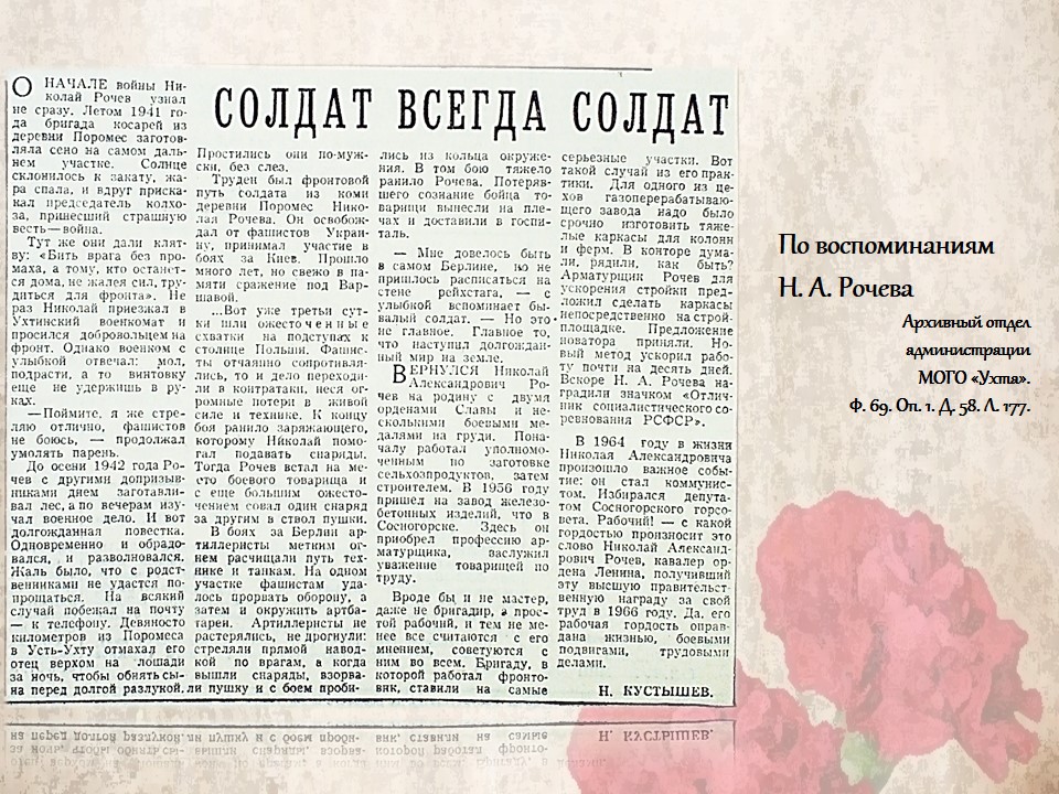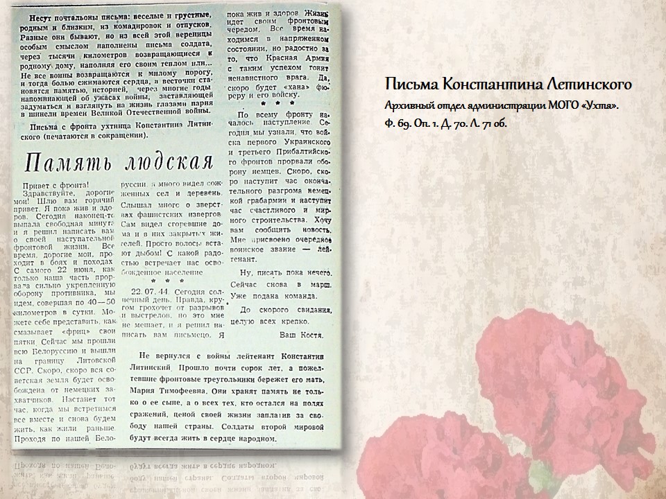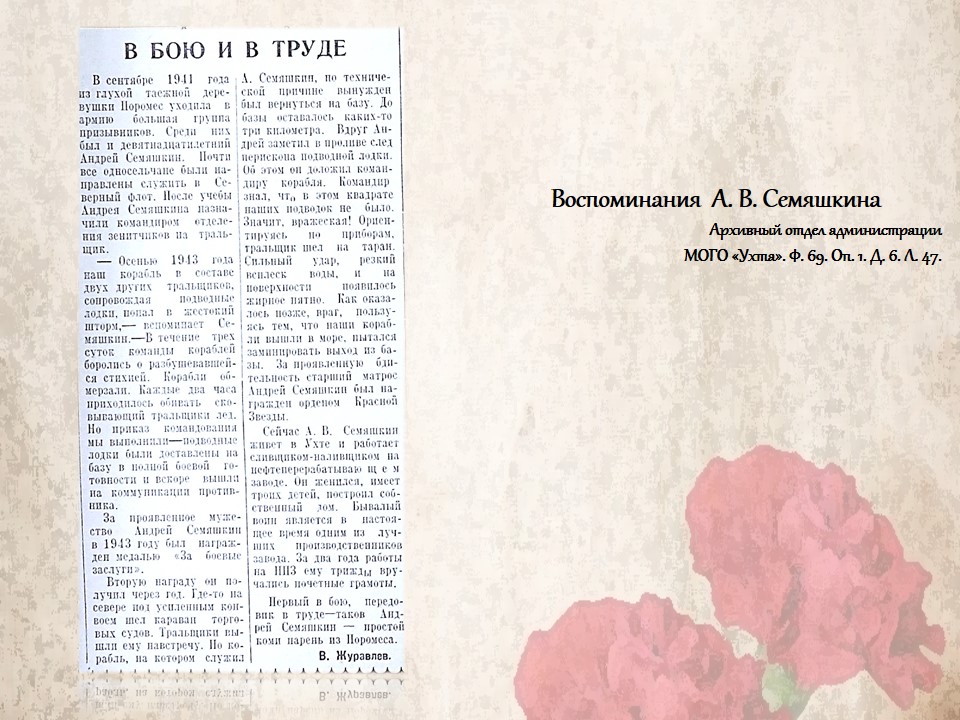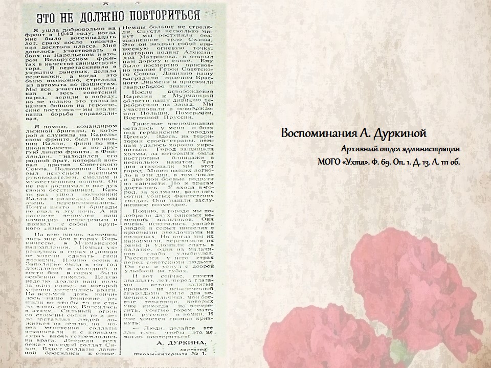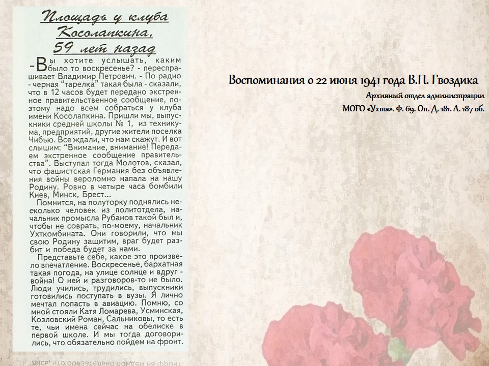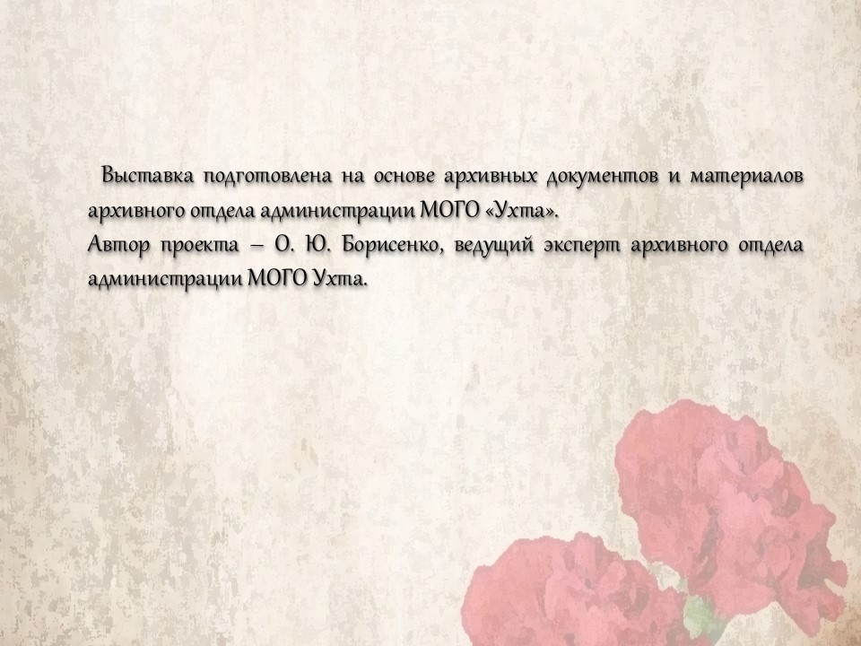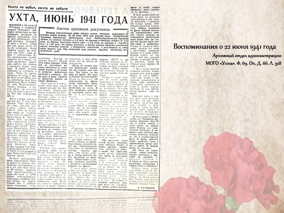 В основе проекта письма и воспоминания ветеранов Великой Отечественной войны и тружеников тыла. Большинство из воспоминаний были опубликованы в газете «Ухта» в разные годы, но от этого не потеряли свою уникальность.