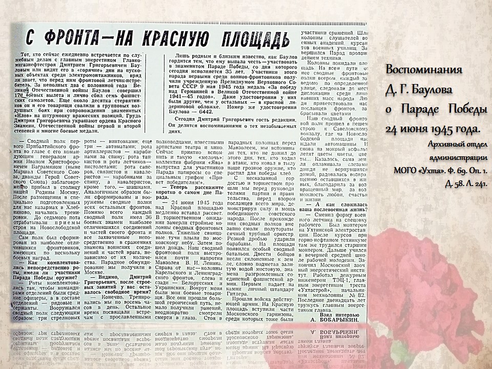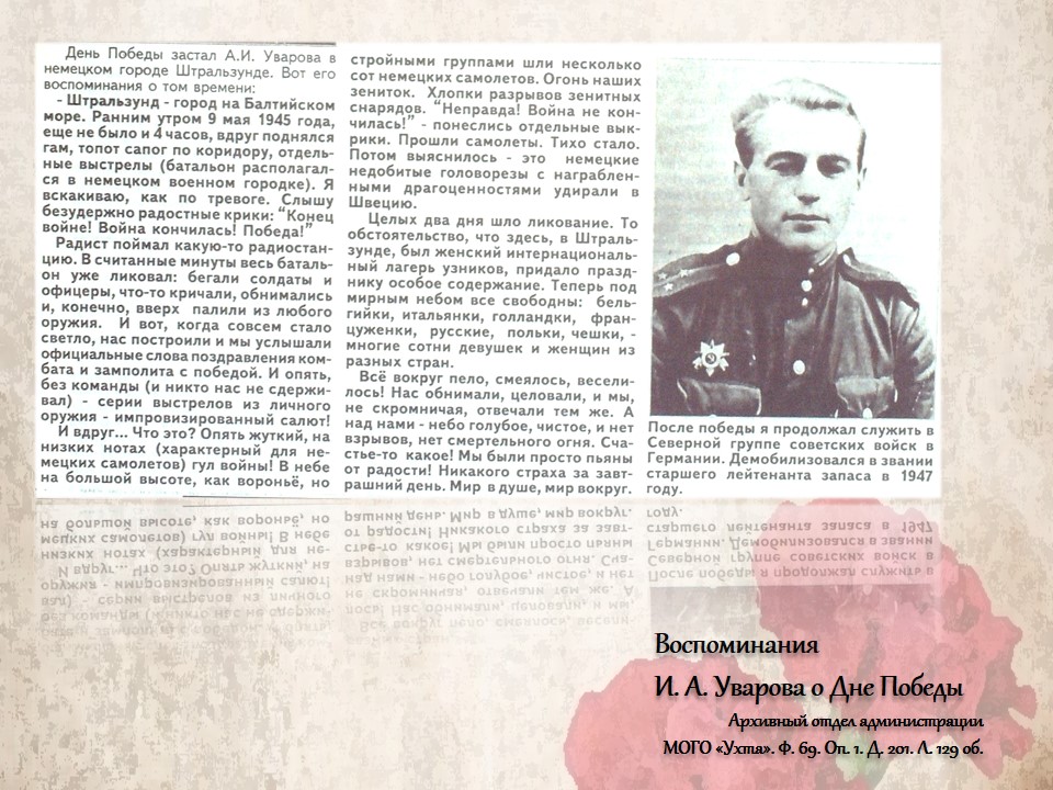 Более семидесяти лет отделяют нас от 9 мая 1945 года, когда советский народ в ходе Великой Отечественной войны одержал Великую Победу над нацистской Германией. Мы не должны забывать героические традиции прошлого. День Великой Победы побуждает нас с уважением и благодарностью вспоминать всех тех, кто самоотверженно сражался с нацизмом на полях сражений и в тылу, кто отдал свои жизни во имя жизни миллионов других людей и сохранил свободу не только нашей Родине, но и другим странам.