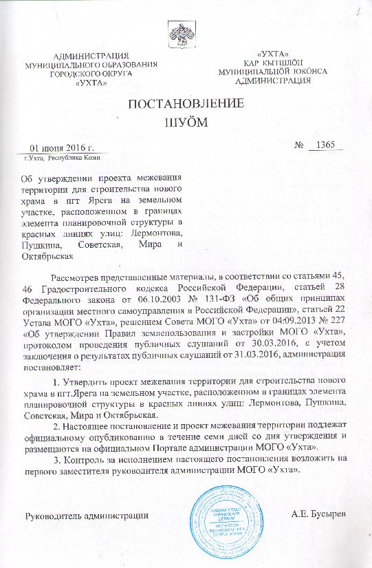 | Подготовка документации по проекту межевания территории для строительства нового храма в пгт.Ярега на земельном участке, расположенном в границах элемента планировочной структуры в красных линиях улиц: Лермонтова, Пушкина, Советская, Мира и Октябрьская | Постановление администрации МОГО «Ухта» от 23.07.2015 № 1634 «О подготовке документации по проекту межевания территории для строительства нового храма в пгт.Ярега на земельном участке, расположенном в границах элемента планировочной структуры в красных линиях улиц: Лермонтова, Пушкина, Советская, Мира и Октябрьская» | Скачать текст постановления |